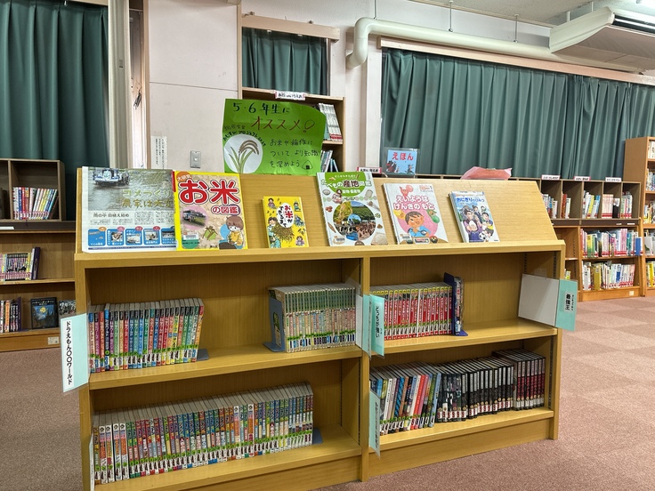 お米や命、農業に関する本が並び、授業以外の場でも子どもたちが興味を持てるよう工夫されています。