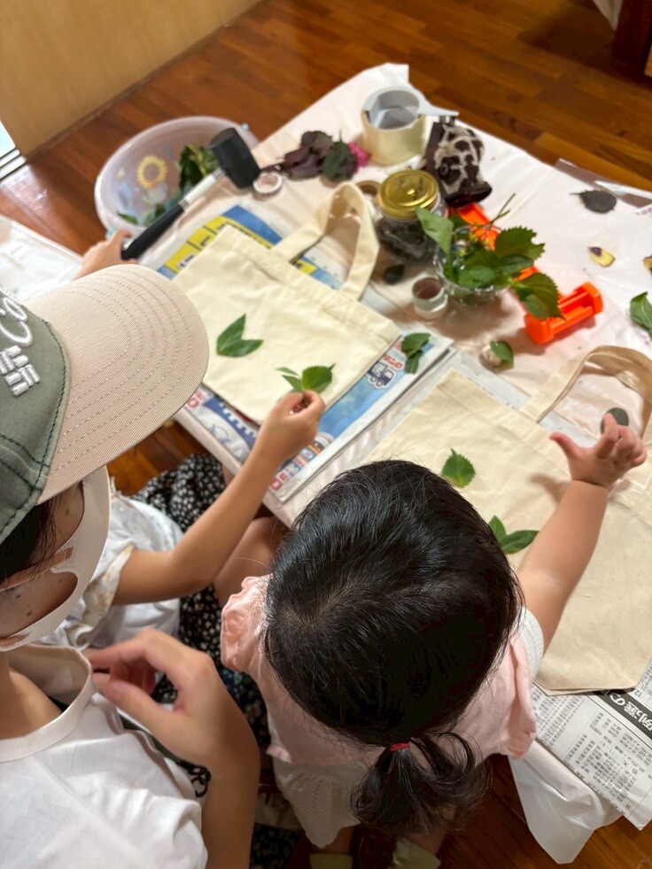 こども部屋では、ミーココスタッフによる【葉っぱのこすり染めワークショップ】や