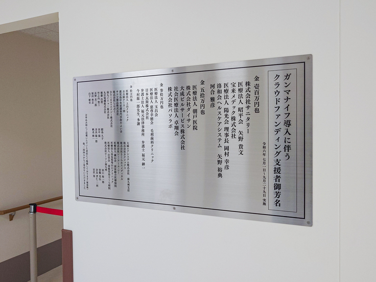 先日引き渡しがおこなわれたガンマナイフセンターの待合室に、ご芳名プレートを設置しました。