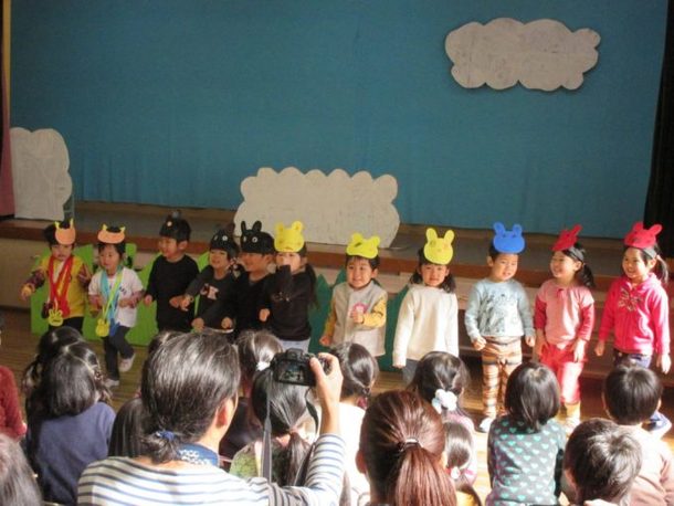 当日は自分たちのお母さん、お父さんたちと目があい、恥ずかしそうにする子もいましたが、それでも一生懸命自分の役割を思い出して演じます。最後に全員で前に並ぶと、誇らしげな、またホッとした表情を見せていました。