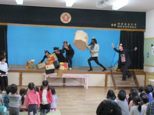 はじめに大人たちが劇を観せます。大好きな先生が演じる、大好きなお母さんお父さんが演じることにより、劇遊びを身近に感じやってみたいと子どもたちが思う。大人の劇が導入となり子どもたちが興味、関心を持って劇遊び活動に入っていきます。