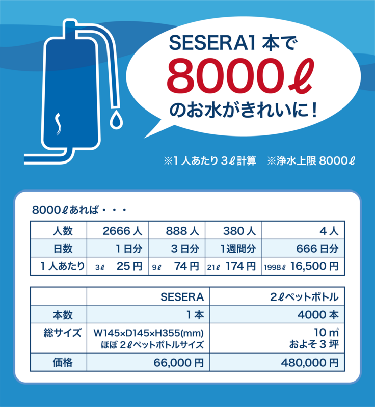 しかも、SESERA1本のお値段は66,000円(税込)で、ペットボトルを備蓄するよりも経済的です。