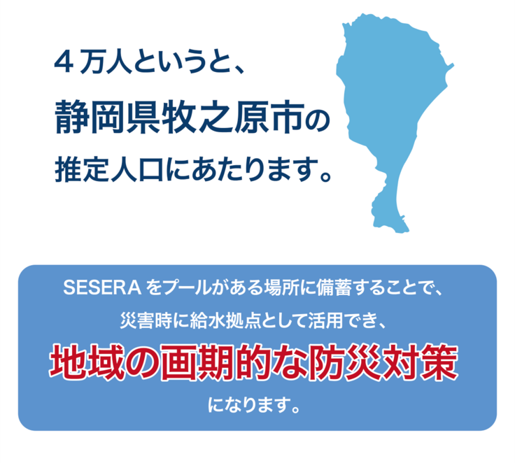 今後は全国のプールに「SESERA」が常備されて日本のどこであっても災害時に飲み水に困らない環境をつくりたい。 その防災対策の未来へのスタートとして、当時お力になれなかった静岡市の方々に、二度と同じ辛い経験をしていただきたくないという思いから、 まずは静岡市内のプールのある施設に「SESERA」を寄贈したいと考えております。