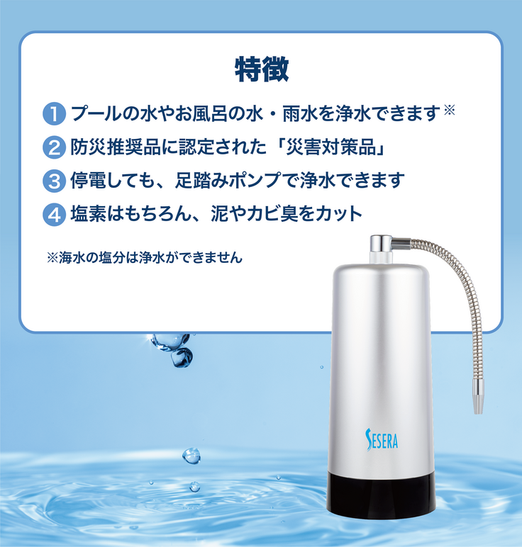 また、各家庭においてもSESERAがあれば、日常的な浄水から、災害時の備えとしてご活用していただくことができます。