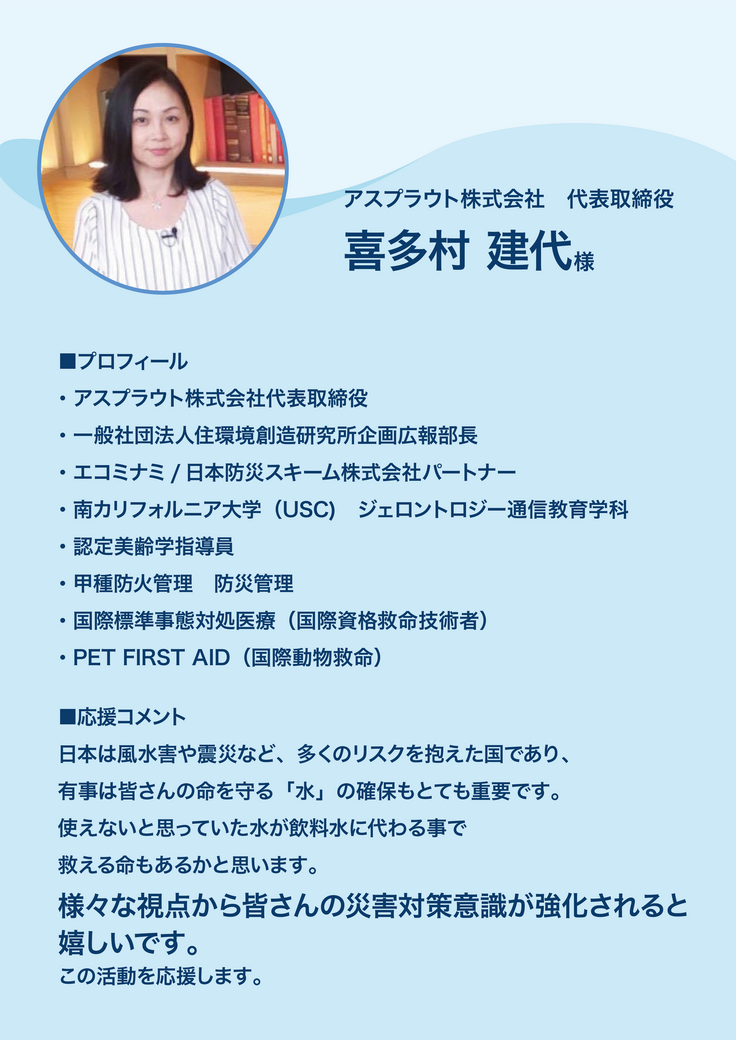 そうすれば、被害の少ないエリアからすぐに浄水を届け合える「水のネットワーク」ができ、災害時の飲み水の問題が解決されると考えています。