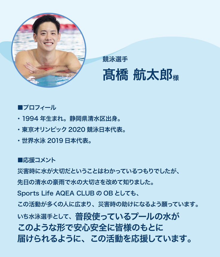 髙橋航太郎選手は昨年9月の断水被害があった静岡市清水区出身で、今回寄付先のSports Life AQEA CLUB様の卒業生でもあります。