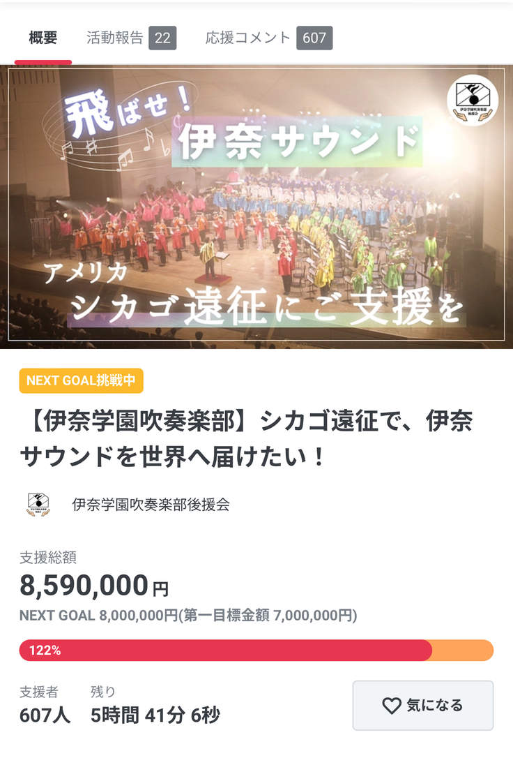 これまで伊奈学園吹奏楽部を応援していただいた皆様の期待に応え、部員がシカゴで伊奈サウンドを思いっきり飛ばせるよう、23時の終了時間まで、ご支援を募っております。