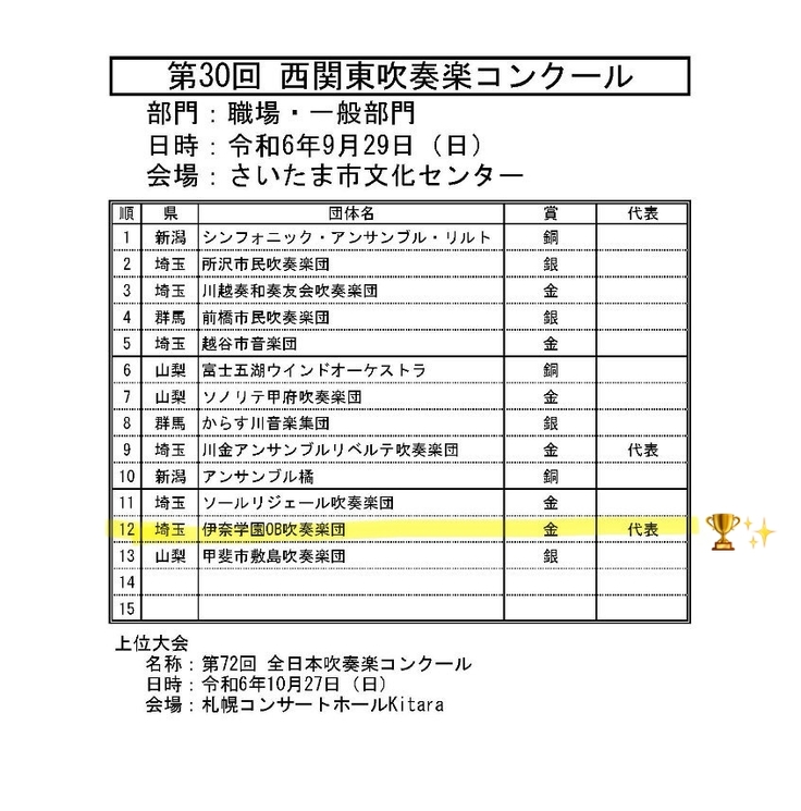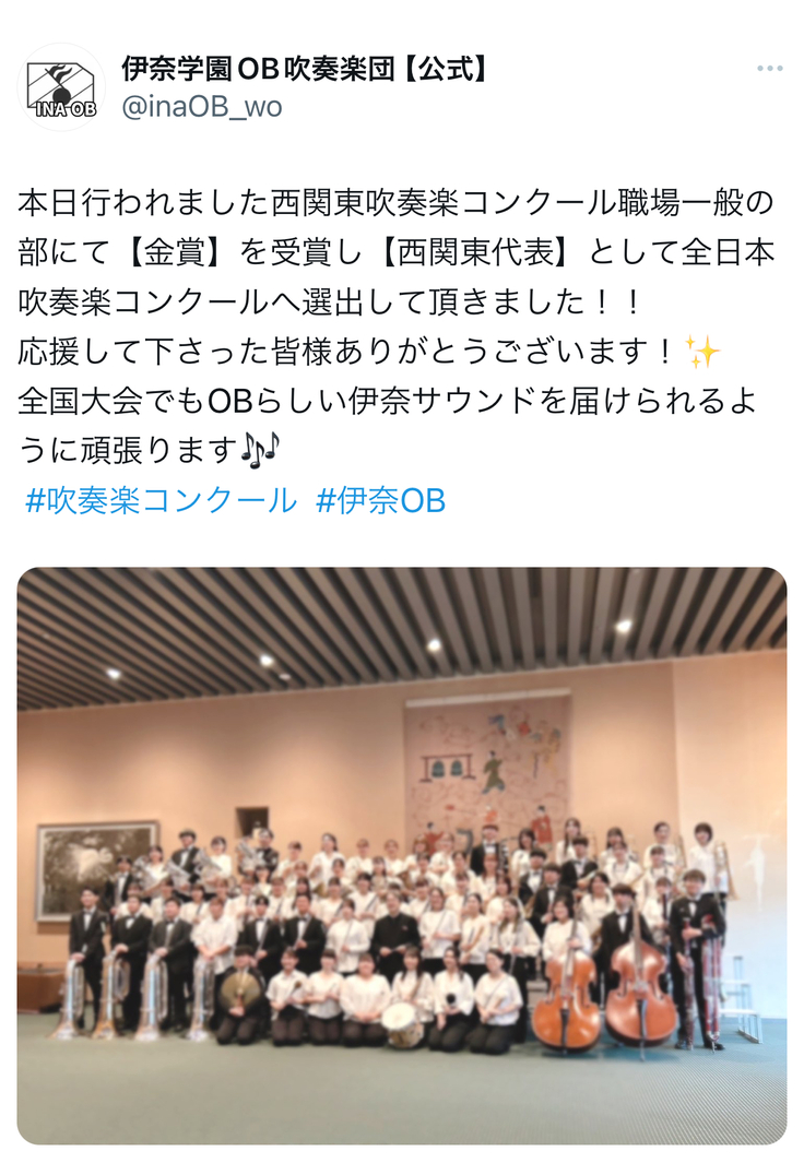 「職場・一般の部」に西関東代表として出場していた伊奈学園OB吹奏楽団の結果報告です‼️