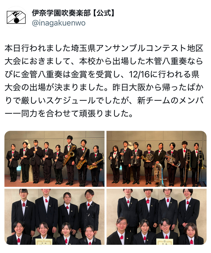 伊奈学園吹奏楽部からは2チーム出場し、両チーム共に金賞受賞、県大会への代表推薦もいただきました‼️