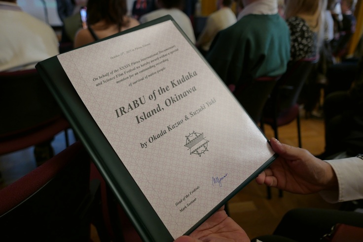 今日は「パルヌ国際映画祭」の授賞式があり、私たちがノミネートした映画『沖縄久高島のイラブー』英語版(IRABŪ of the Kudaka Island, Okinawa)が「先住民部門(indigenous peoples want to survive)」で特別賞を受賞しました。