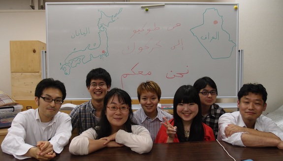 △ある晩のミーティングに集まったチームメンバー。アラビア語で「東京からキルクークへ、私たちはみなさんと共にいます」とメッセージを書きました