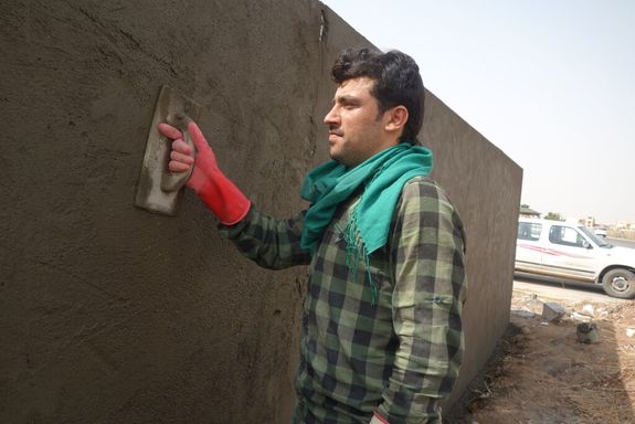 塀の石膏作業を行うシリア難民の男性