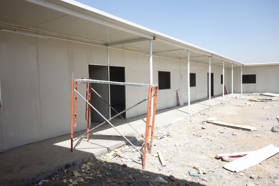 校舎建設の現場では、プレハブが順調に組み立てられ、校舎らしい姿が徐々に見えてきました。