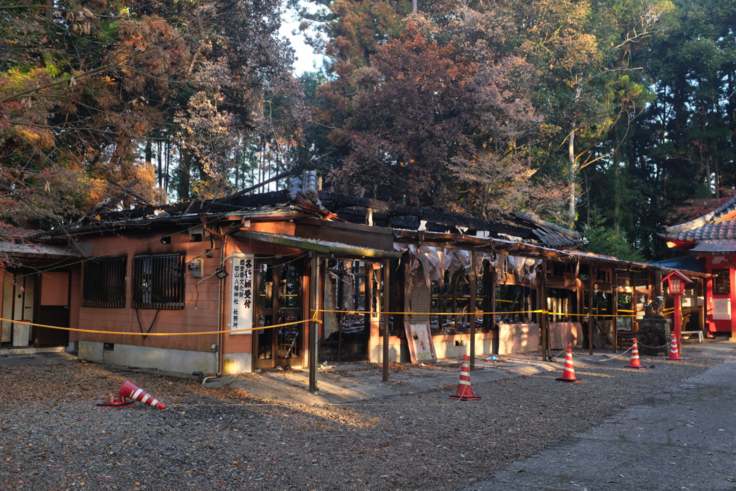 2022年、そんな神社に二度の災難が降り掛かります。9月に上陸した台風14号による鳥居の崩壊、そして11月の秋季大祭当日に起こった火災です。この火災で社務所は全焼、正月を目前に準備を進めていた神符や巫女装束などの備品も全て焼失してしまいました。