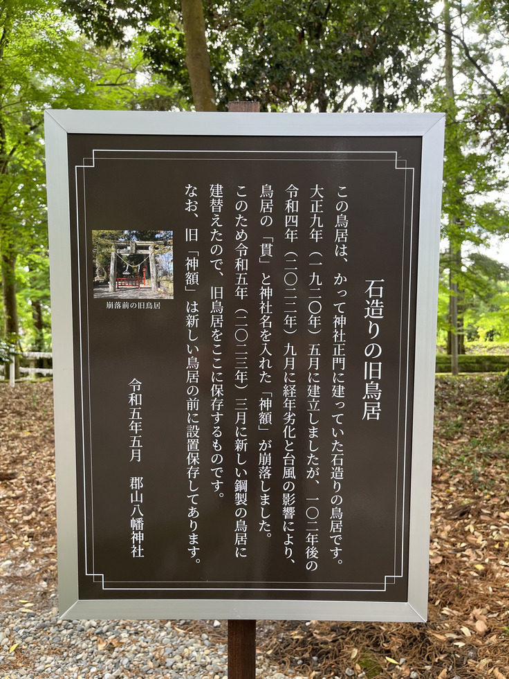 4月末、昨年台風で崩落した旧鳥居が郡山八幡神社の境内に移設・保存されました。