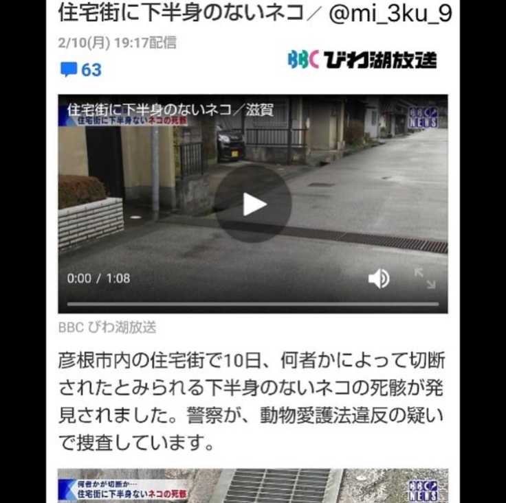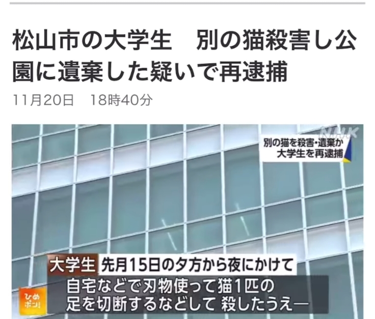 先月、愛媛で猫のバラバラ遺体を公園に遺棄し捕まった犯人(大学生)、たくさんの猫が犠牲になりましたが大した罪にはなりません。