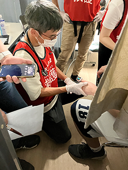 なかには転倒による裂傷も有りました。混雑する祭りの中で転倒し、裂傷を負った方々に対しては、応急処置を施しました。