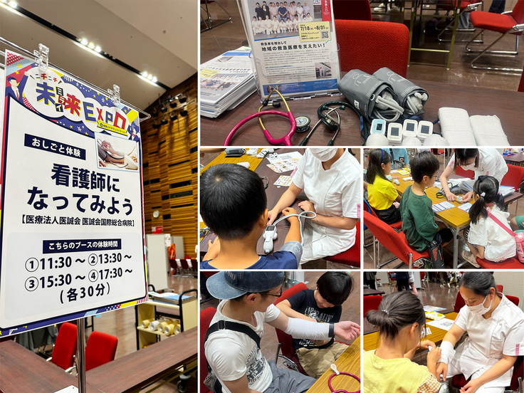 8月3日(土)、4日(日)に開催されたニチニチ未来EXPO(会場:城東スギタクレストホール)に出展し、地域にお住まいの皆さんに、看護師さんのお仕事の一部、血圧、脈拍、酸素濃度の測定・心音聴診・包帯の巻き方を体験していただきました。