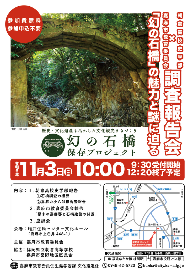 この石橋の応急保全措置を行うにあたり、石橋の希少性が注目されるきっかけとなった、朝倉高校史学部のみなさんをお招きして、「幻の石橋」といわれる、「桑野の梯橋(かけはしばし)」の魅力と謎に迫るイベントを開催いたします。