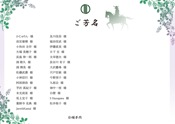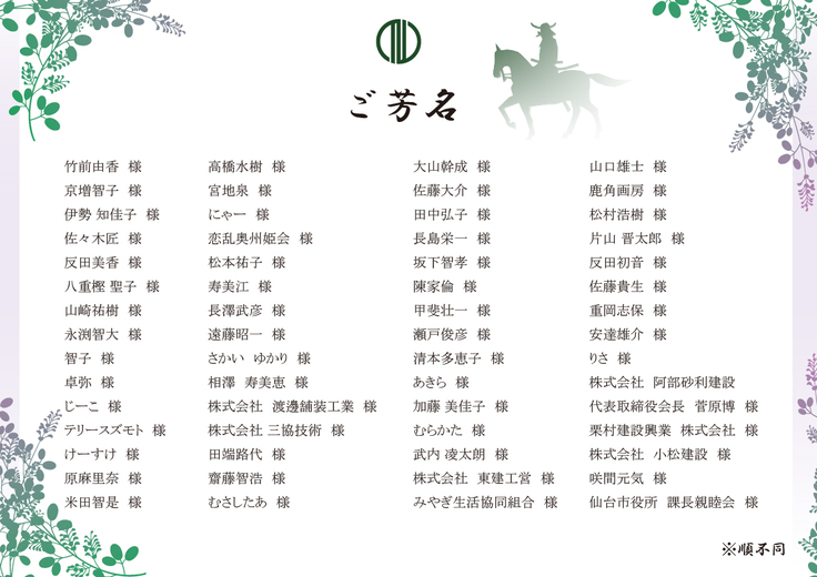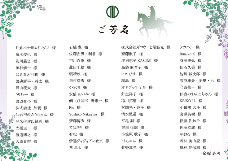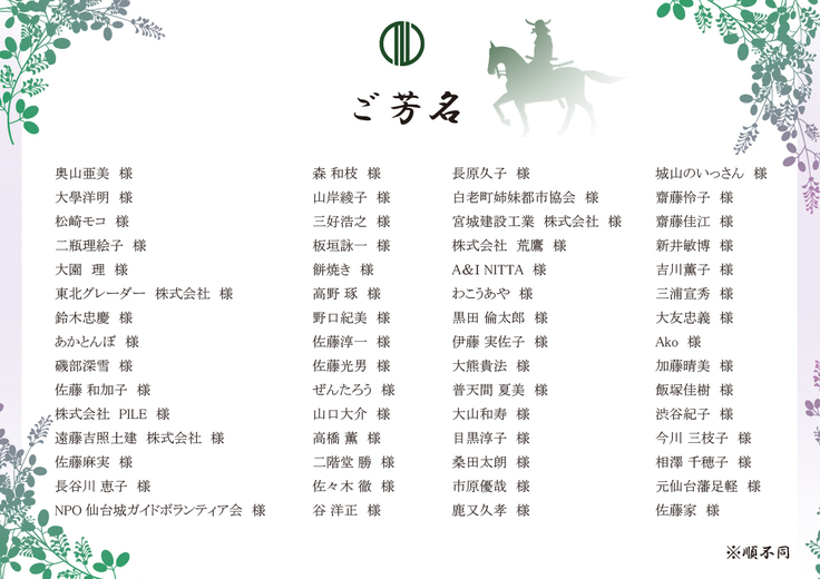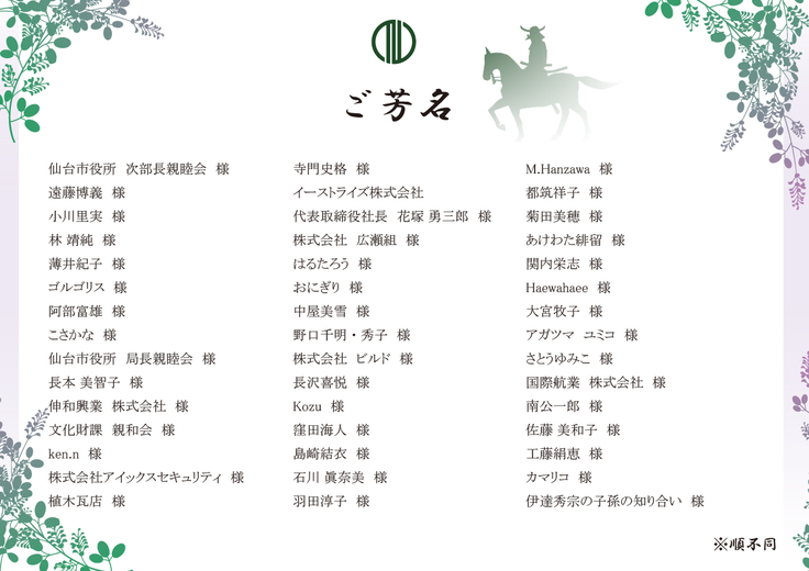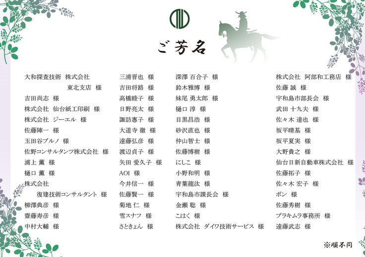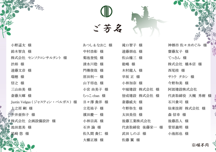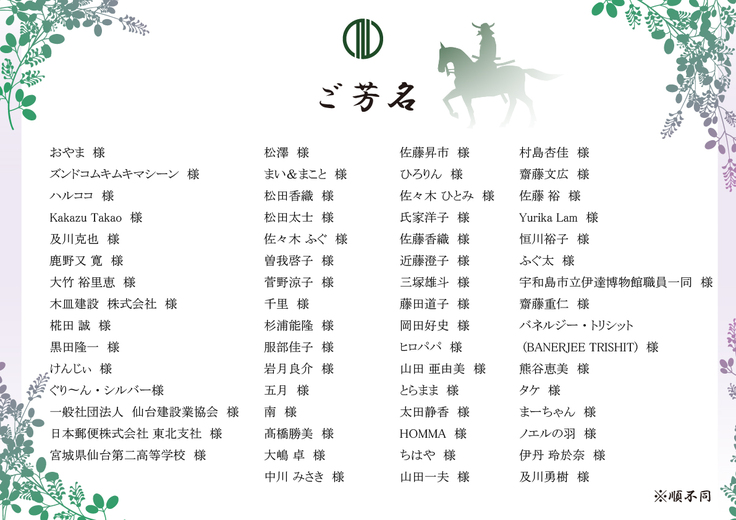 ※3:ご芳名の作成にあたっては、細心の注意を払いましたが、万が一誤記にお気づきの際は、お手数ですが下記連絡先までお申出くださいますようお願い申し上げます。