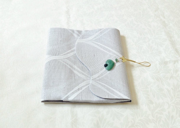 懐紙入れや御朱印帳カバーに使用している上質な生地を使用しています。御朱印帳カバーの制作訓練のために、一番難しい勾玉の部分をデザイ