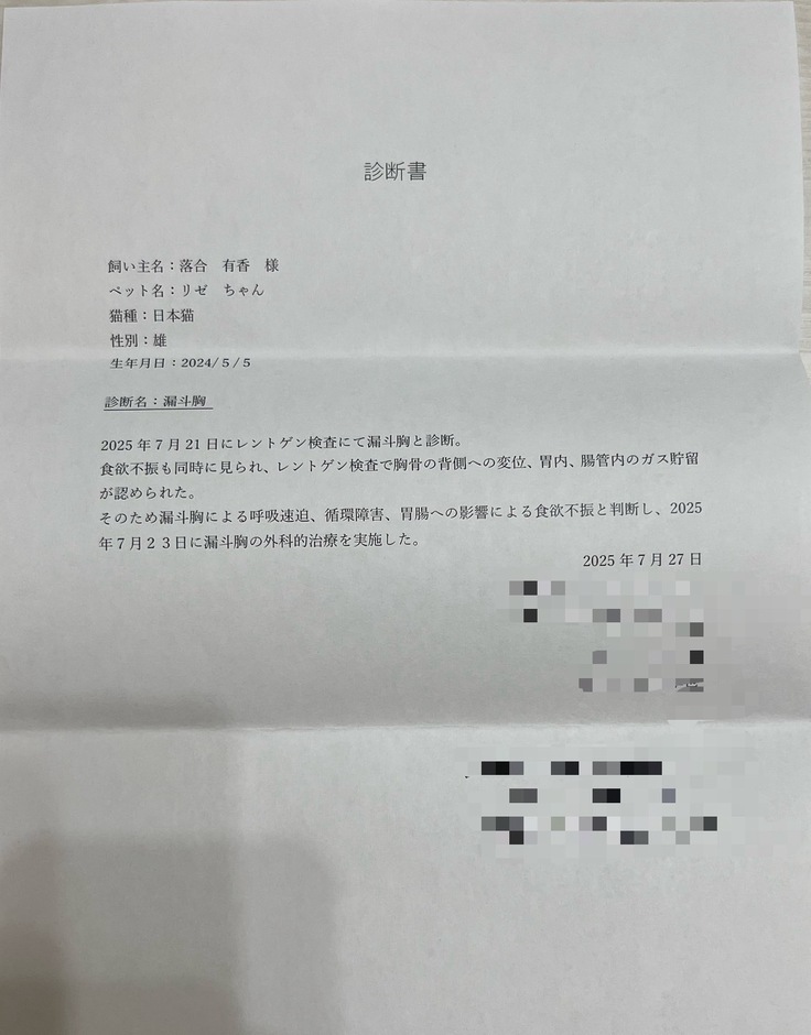 ※『漏斗胸』とは猫の胸骨(胸の中央にある骨)が内側に凹んでしまう先天性の病気です。この凹みによって、心臓や肺が圧迫され、呼吸困難や循環器系の障害を引き起こすらしいです。