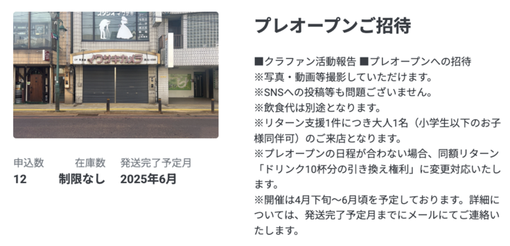 プレオープンには、こちらの「プレオープンご招待」のリターンで支援してくださった方のみ、ご来店いただけます。