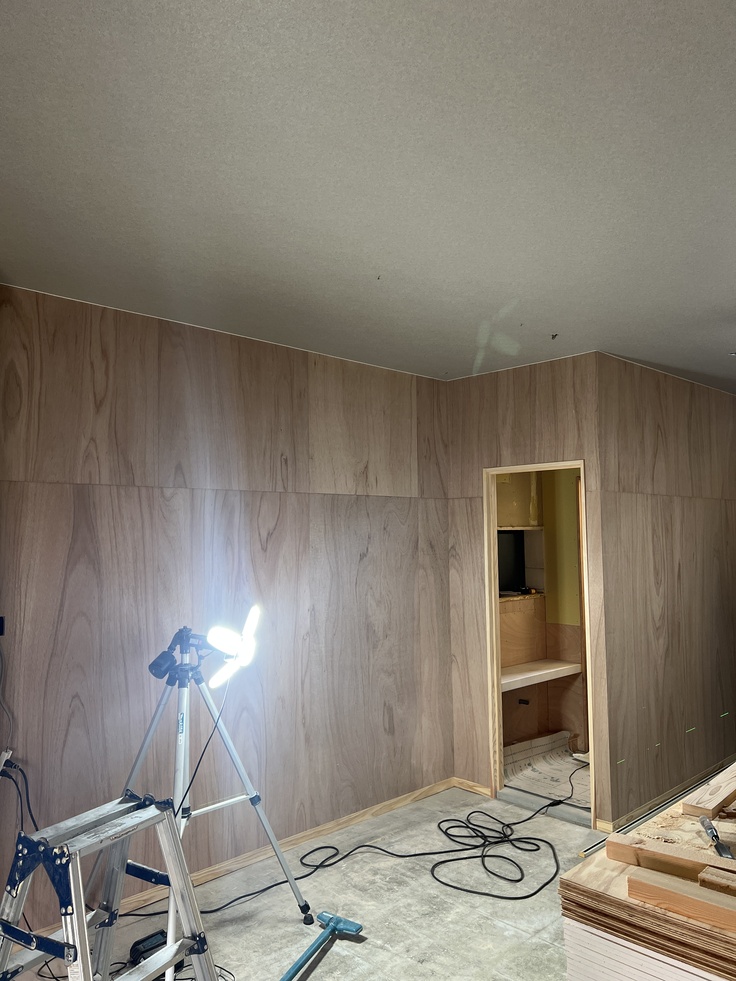 剥き出しだった壁には木の板が張られ、あらわしの床は磨かれ本来のモルタルの風合いが。