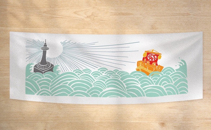 京都タワーの灯台を目印に楽器がたくさん載った宝船が荒波が進んでいきます。