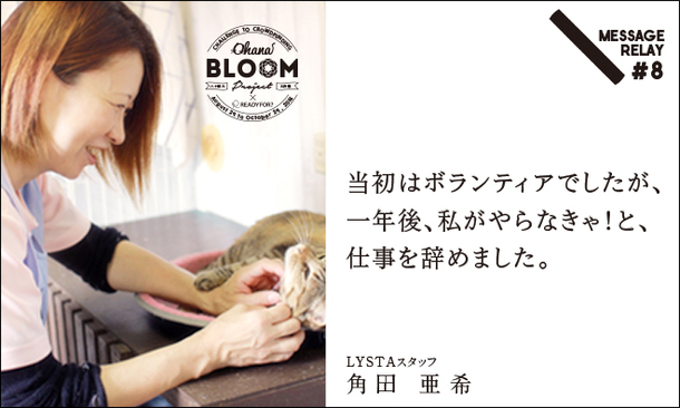 第8回目の『メッセージリレー』は、LYSTAでスタッフとして猫の世話を中心にされている角田亜希さんです。