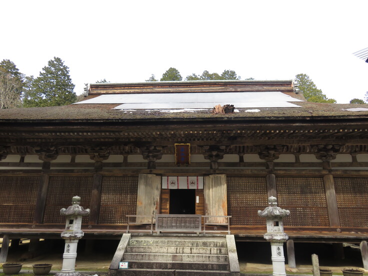 現在の本堂は、旧本堂が延文5年(1360)火災で消失した後、7年の歳月をかけて貞治5年(1366)に再建されたもので、国宝に指定されております。桁行七間、梁間五間、入母屋造、檜皮(ひわだ)葺で、天台密教仏殿といい、その基本形は比叡山の根本中堂です。