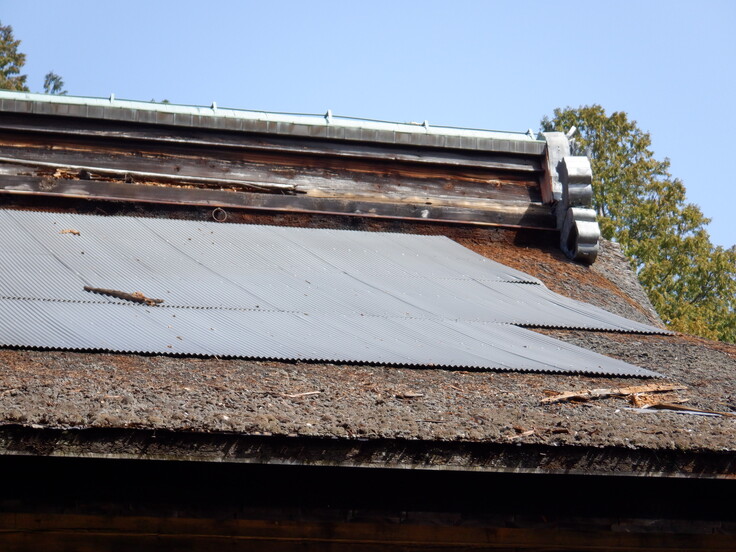 前回の修繕から48年もの歳月が経った本堂屋根檜皮葺は、15年ほど前の台風による被害をきっかけに徐々に損傷がひどくなり、現在はトタンを被せるなどしてなんとか耐え忍んでいる状態です。