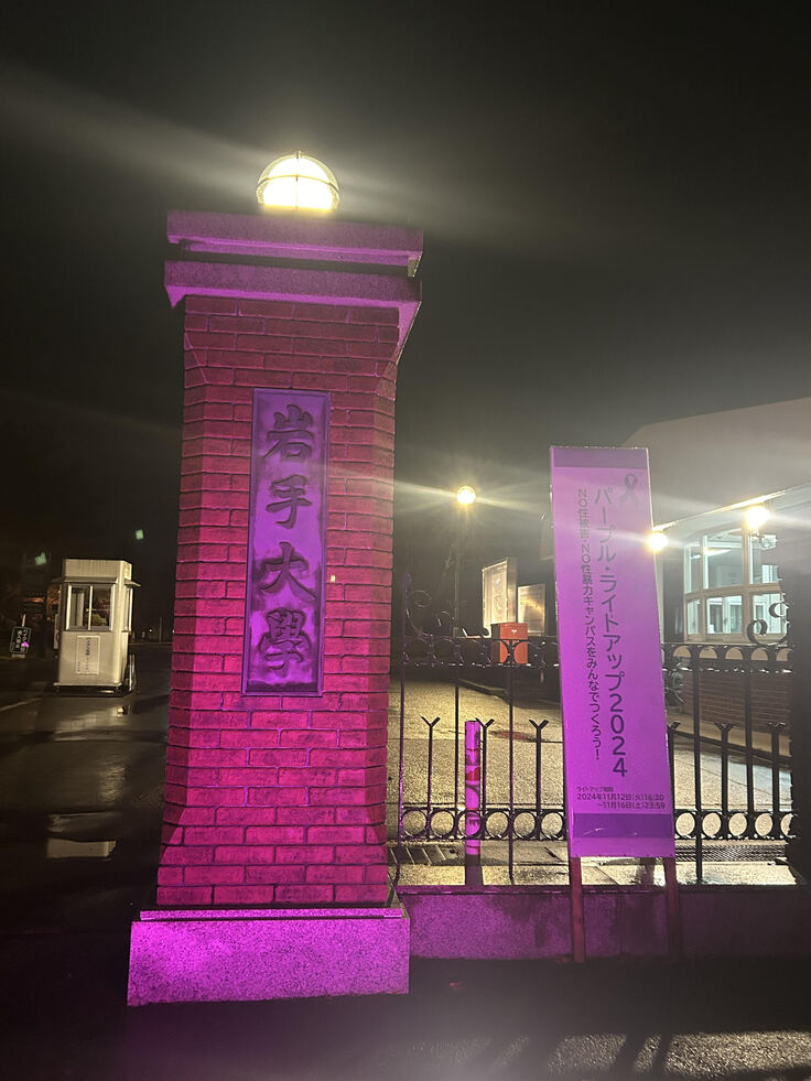 岩手大学では、内閣府男女共同参画局が性被害、性暴力の根絶を目指し、「女性に対する暴力をなくす運動」期間(11月12日~11月25日)に実施を呼び掛けている「パープル・ライトアップ」に参加し、本学での性被害、性暴力防止のための啓発を行っています。