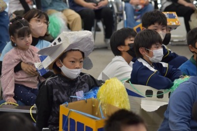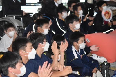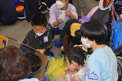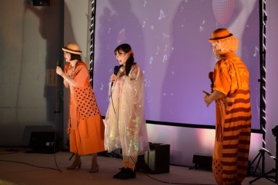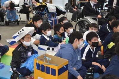 第1回公演は岩見三内小学校・中学校ときらり支援学校、栗田支援学校、障がい福祉サポートセンター聖和、多機能型ケアベースにのに、と一般の方での鑑賞でした。障がいの有無に関係なく、お互い話しかけてみんなで楽しく参加しました。岩見三内小学校・中学校も、ソーラン節を歌ってイブちゃんを元気づけました。最後の曲では、メッセージを伝えてくれたジャスミンに応えるかのように子どもたちの歌声がひろがりました。
