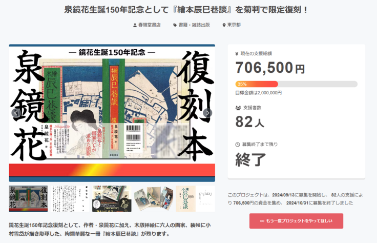 今回の『繪本辰巳巷談』プロジェクトは、クラウドファンディングを通じた読者との新たな接点を探る挑戦でもあります。もし達成されれば、希少な鏡花本をはじめとする復刻が待たれる古書が再び世に出る一つの成功例として示せるでしょう。このプロジェクトの成果が今後の出版活動においても大きな気付きをもたらし、読者とのより深い繋がりを築きながら、貴重な書籍の復刻が続いていくことを期待しています。