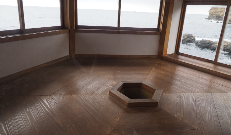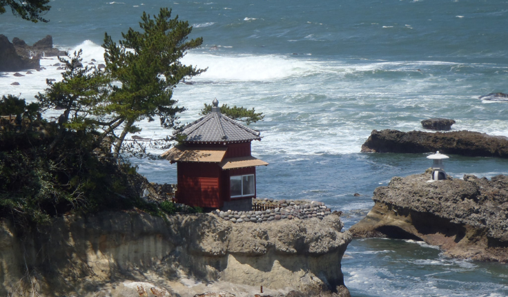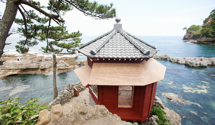 茨城県北部、五浦海岸。ごつごつとした岩が海面から顔を出し、その前に静かに佇む“六角堂”。背に六角堂を感じながら太平洋を望むと、波の音に耳を澄ませる天心の気配が、時空を超えて胸に迫ってきます。