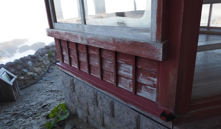 塩害の対策をするために、耐久性の高い材質に変更したり、建築物の移設を行うということも考えられますが、この海に面した場所にあることこそが当研究所の特性であり、天心ありし頃の景観を守るために大きな変更を加えたくないという思いで、これまでなんとか保存・管理を行ってきています。