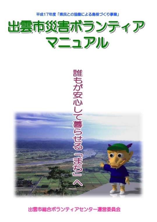 出雲市総合ボランティアセンター運営委員会は、平成17年に島根県の「県民と協働による島根づくり事業」に採択され島根県、出雲市、出雲市社会福祉協議会と協働し「出雲市災害ボランティアマニュアル」を作成しました。これより災害発生時に出雲市社会福祉協議会と出雲市災害対策本部ボランティア班と出雲市総合ボランティアセンター運営委員会の3者協働により「出雲市災害ボランティアセンター」を立ち上げることになりました。
