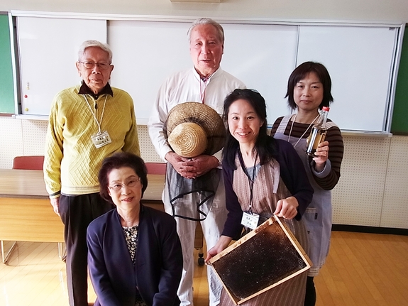 (巣箱を持っているのが浜崎さんです。近くの学校などでミツバチの大切さを教えています。)