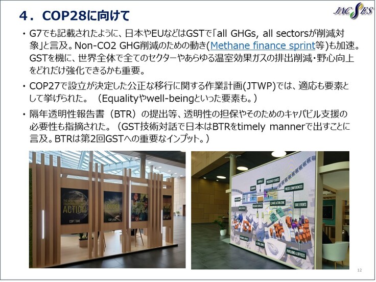GSTを機に、世界全体で全てのセクターやあらゆる温室効果ガスの排出削減・野心向上をどれだけ強化できるかも重要と考えます。