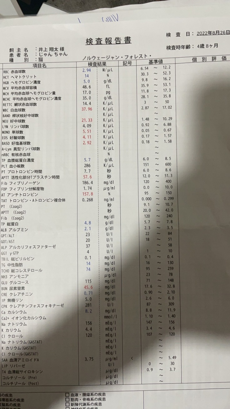 ただ、じゃんが重度の貧血になっていることがわかりCTなどの全身麻酔の検査は耐えられない可能性がある。ということを言われてしまいました。