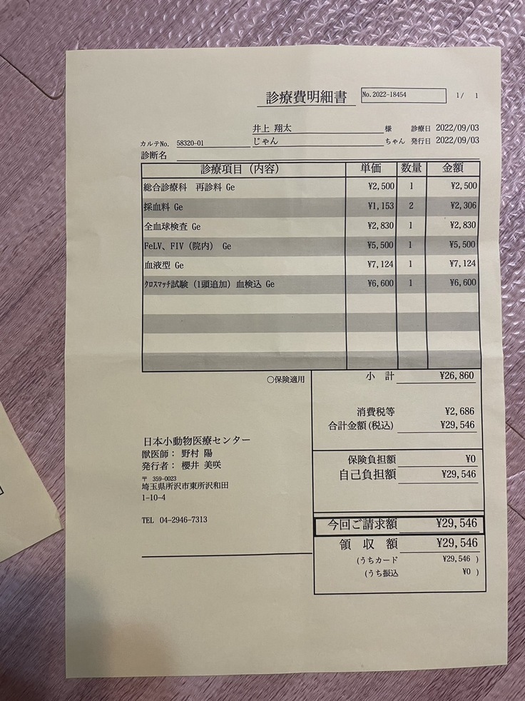 ↓その時にかかった検査費用 8月26日 (動物病院から掲載許諾を得ています)