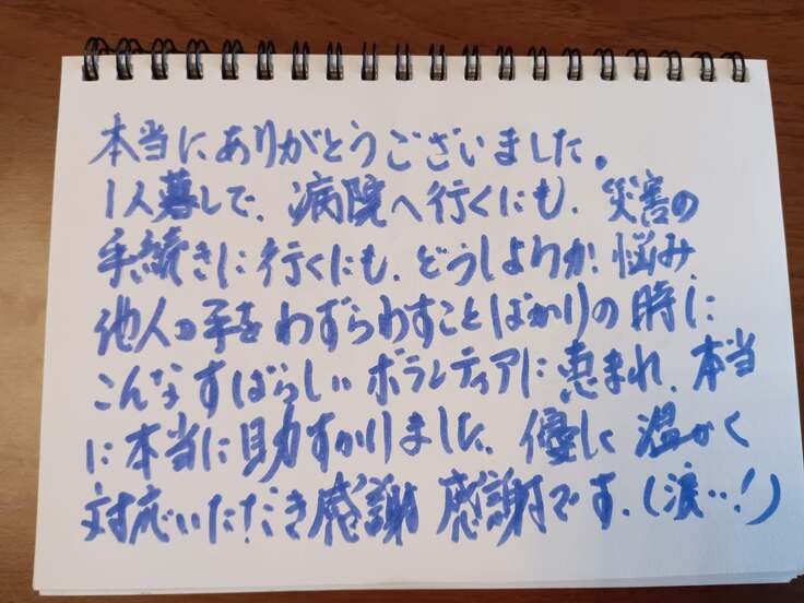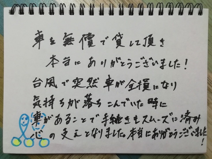 下の写真は、災害時に車を借りた方が記入してくださった最近の「ありがとうノート」です。日本各地の利用者の思いが書き綴られています。