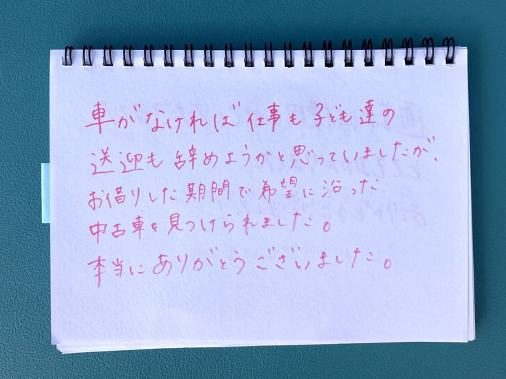 熊本拠点で無償貸出し支援をご利用いただいた方から、お車のご返却の際にメッセージをいただきました。