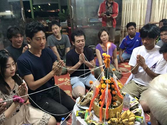 「バシー」とよばれるラオス伝統のお祈りで、撮影の無事と映画の成功を祈りました。