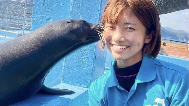 『まりりん』も今年の4月に入社したばかりの新米トレーナーです。現在は和歌山県にある、姉妹施設のドルフィンリゾートで助っ人として頑張ってくれています!とっても頑張り屋さんなまりりんをぜひ応援してあげてください!ドルフィンリゾートにもかわいいイルカたちやヤギや羊、カメもいるので足を運んでみて下さい♪