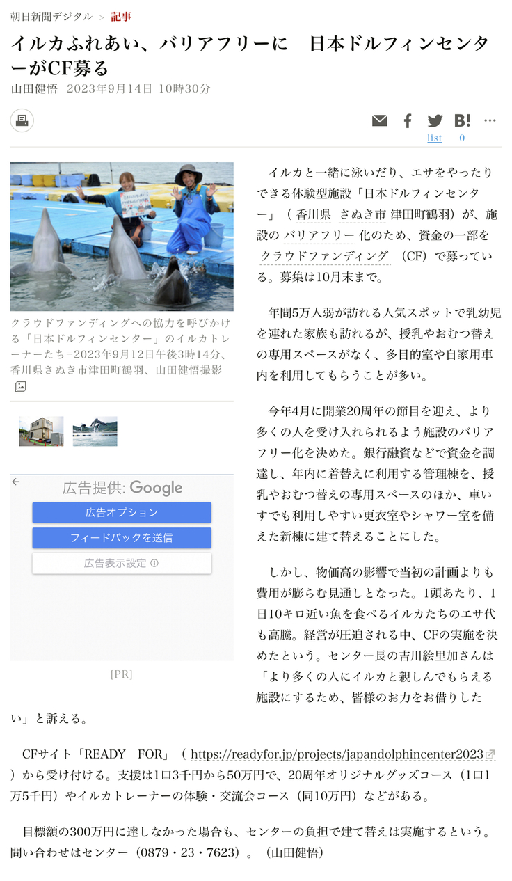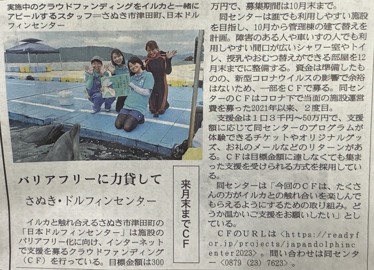 先日、四国新聞様、朝日新聞様に日本ドルフィンセンターのクラウドファンディングをご紹介いただきました。