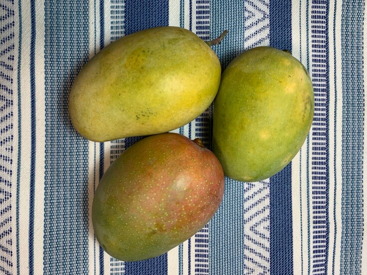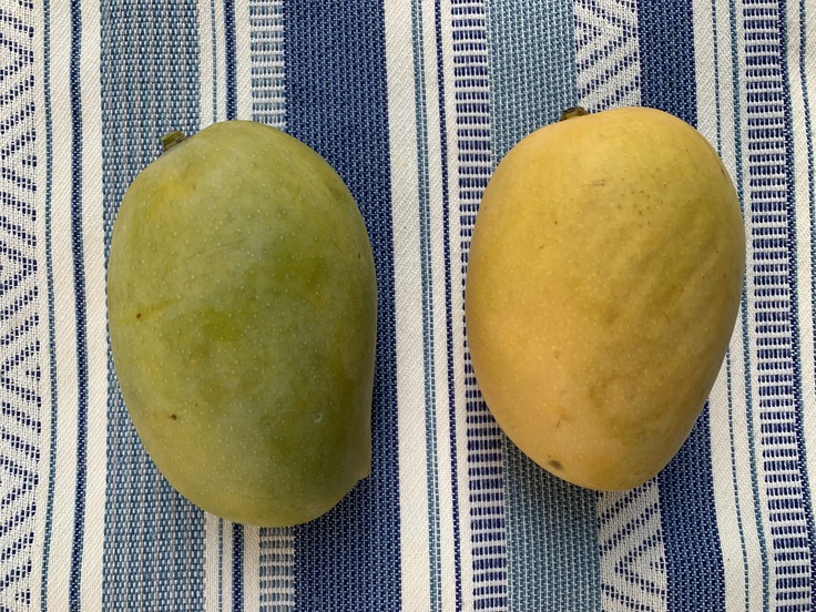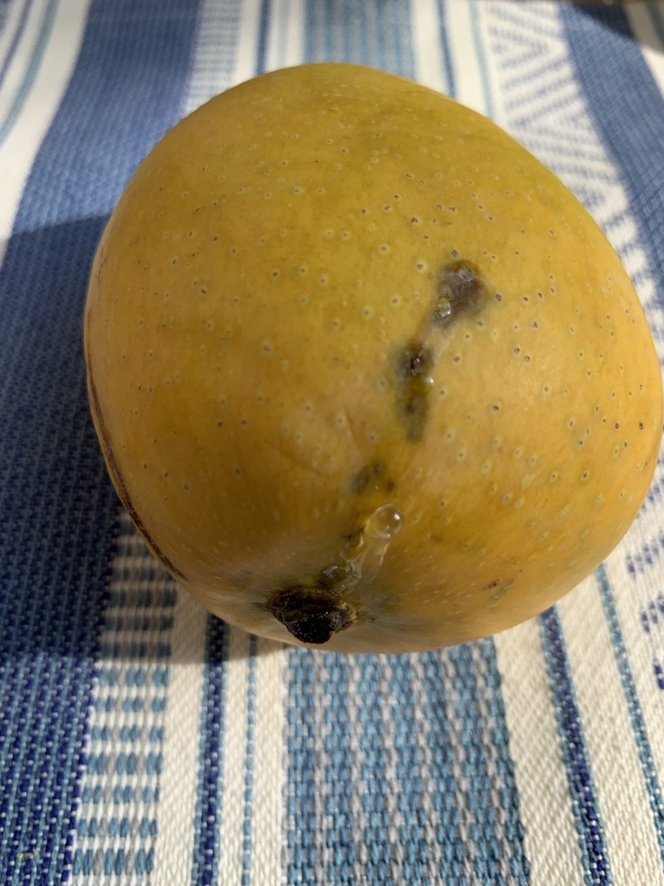 ●マンゴーの色が緑色から黄色(赤みがかる場合もあります)に変わってきたら食べ頃です。(写真②)全体が黄色でなくても良い香りがし、柔らかくなってきたら大丈夫です。熟していく過程で、へた部分から樹液が出て、その樹液に触れた表皮の色が黒く変色してしまう場合がありますが、品質には全く問題ありません。(写真➂)