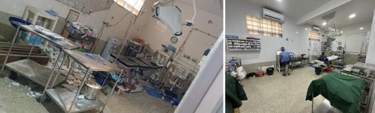 <地震後の手術室(左)、復旧後の手術室(右)>
