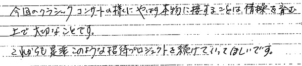 ・ジャンルを問わず、音楽に縁遠く、ご招待いただかないとホールで聞く機会はなかったと思います。コンサート前に、娘がバイオリンに触れてみたいと言っていただけに、集中して聞いているのをみて、貴重な経験をさせていただいたと感じました。ありがとうございました。